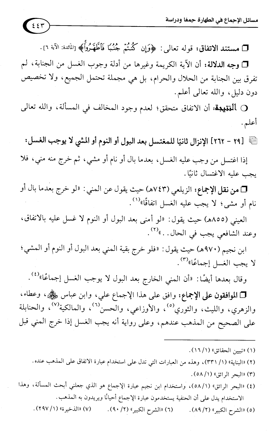 ابن نجيم (970 هـ) حيث يقول: "فلو خرج بقية المني بعد البول أو النوم أو المشي؛ لا يجب الغسل إجماعًا" (¬3).