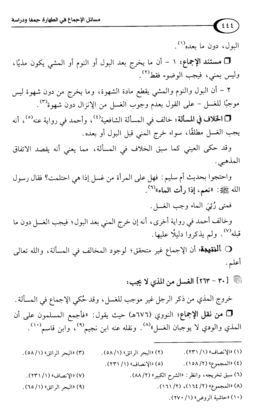 • من نقل الإجماع: النووي (676 هـ) حيث يقول: "فأجمع المسلمون على أن المذي والودي لا يوجبان الغسل" (¬8). ونقله عنه ابن نجيم (¬9)، وابن قاسم (¬10).