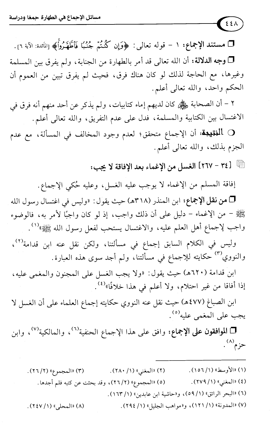 ابن قدامة (620 هـ) حيث يقول: "ولا يجب الغسل على المجنون والمغمى عليه، إذا أفاقا من غير احتلام، ولا أعلم في هذا خلافًا" (¬4).