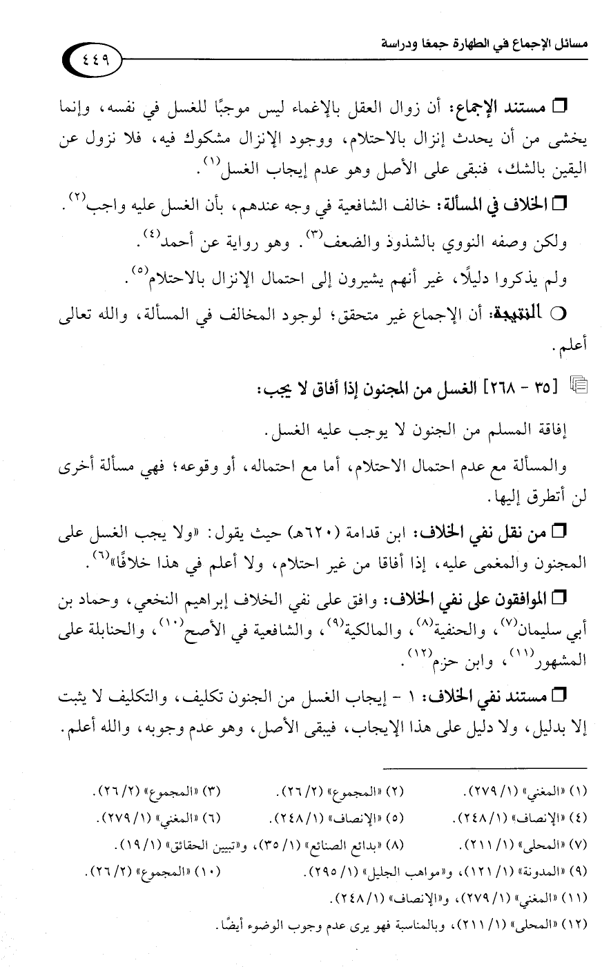 • من نقل نفي الخلاف: ابن قدامة (620 هـ) حيث يقول: "ولا يجب الغسل على المجنون والمغمى عليه، إذا أفاقا من غير احتلام، ولا أعلم في هذا خلافًا" (¬6).