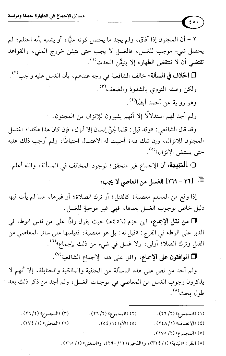 وقد قال الشافعي: "وقد قيل: قلما جُنَّ إنسان إلا أنزل، فإن كان هذا هكذا؛ اغتسل المجنون للإنزال، وإن شك فيه؛ أحببت له الاغتسال احتياطًا، ولم أوجب ذلك عليه حتى يستيقن الإنزال" (¬5).Rأن الإجماع غير متحقق؛ لوجود المخالف في المسألة، واللَّه أعلم.