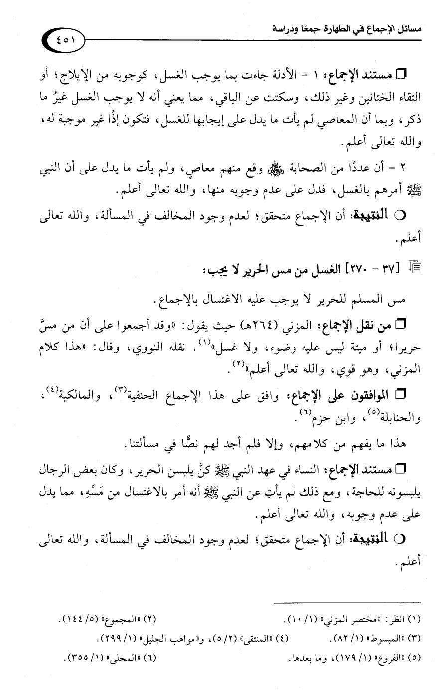 • من نقل الإجماع: المزني (264 هـ) حيث يقول: "وقد أجمعوا على أن من مسَّ حريرا؛ أو ميتة ليس عليه وضوء، ولا غسل" (¬1). نقله النووي، وقال: "هذا كلام المزني، وهو قوي، واللَّه تعالى أعلم" (¬2).