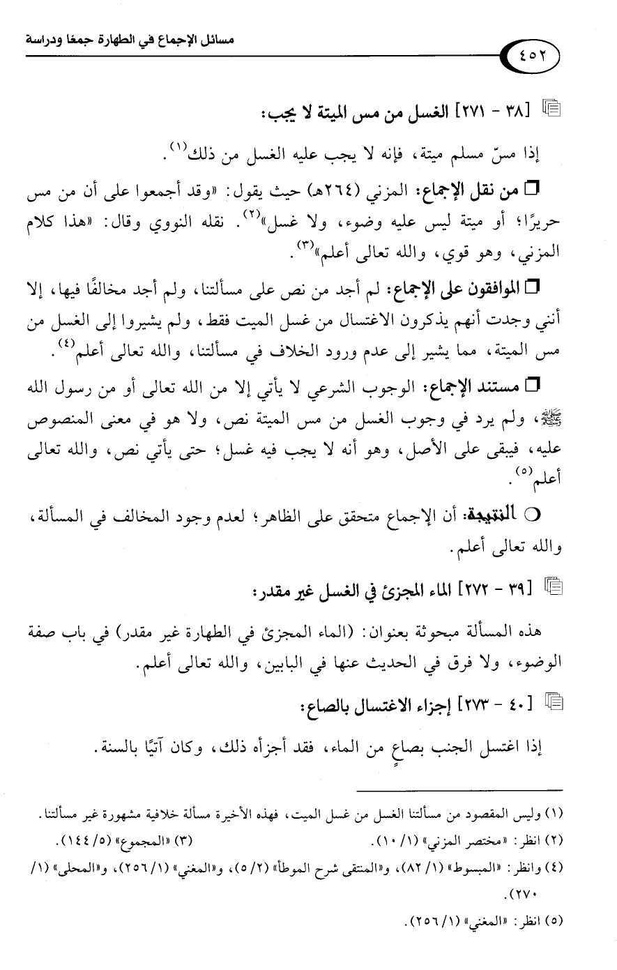 • الموافقون على الإجماع: لم أجد من نص على مسألتنا، ولم أجد مخالفًا فيها، إلا أنني وجدت أنهم يذكرون الاغتسال من غسل الميت فقط، ولم يشيروا إلى الغسل من مس الميتة، مما يشير إلى عدم ورود الخلاف في مسألتنا، واللَّه تعالى أعلم (¬4).