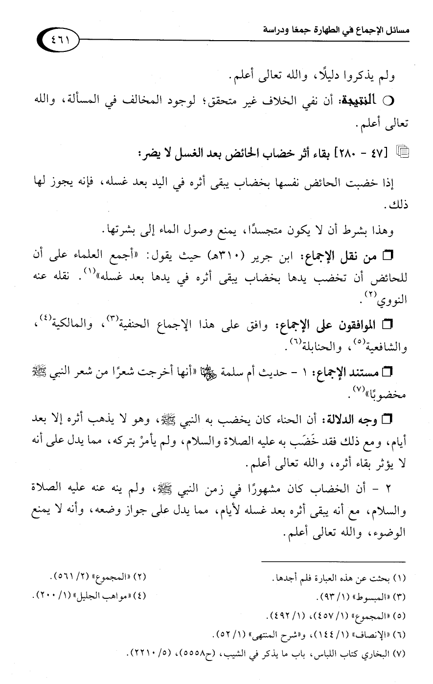 • من نقل الإجماع: ابن جرير (310 هـ) حيث يقول: "أجمع العلماء على أن للحائض أن تخضب يدها بخضاب يبقى أثره في يدها بعد غسله" (¬1). نقله عنه النووي (¬2).
