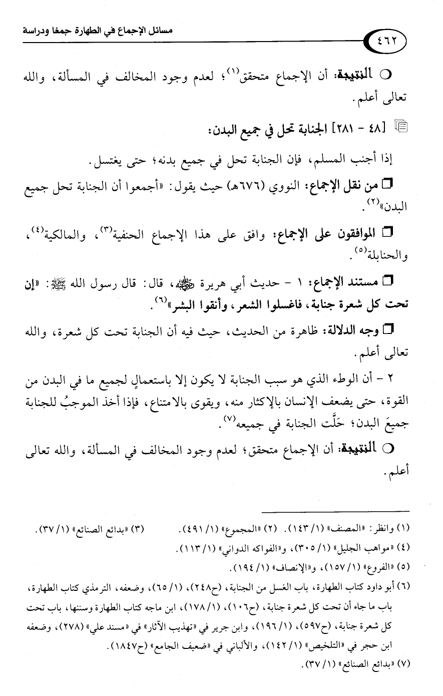 • من نقل الإجماع: النووي (676 هـ) حيث يقول: "أجمعوا أن الجنابة تحل جميع البدن" (¬2).