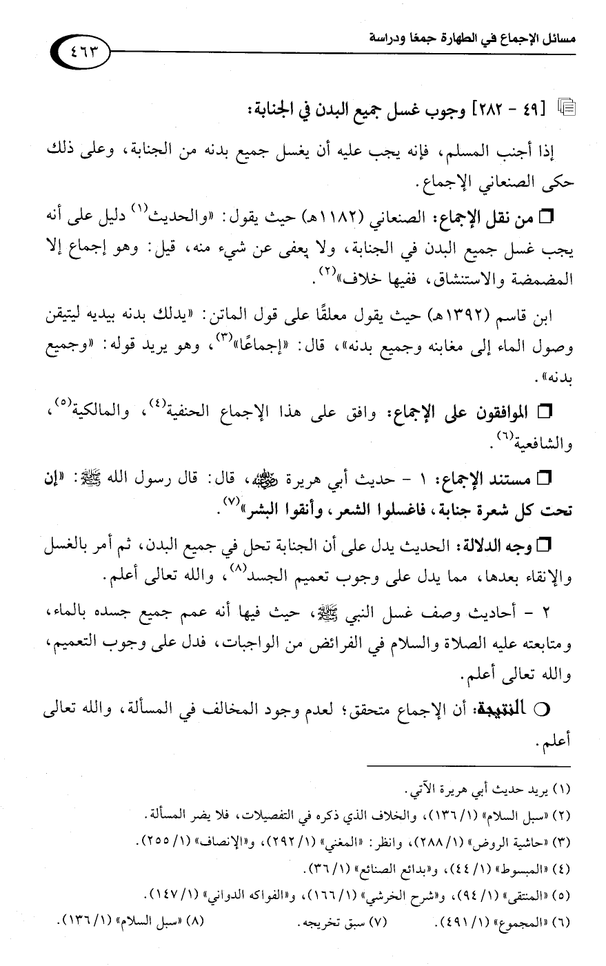 ابن قاسم (1392 هـ) حيث يقول معلقًا على قول الماتن: "يدلك بدنه بيديه ليتيقن وصول الماء إلى مغابنه وجميع بدنه"، قال: "إجماعًا" (¬3)، وهو يريد قوله: "وجميع بدنه".