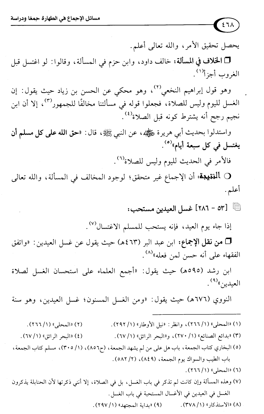 • من نقل الإجماع: ابن عبد البر (463 هـ) حيث يقول عن غسل العيدين: "واتفق الفقهاء على أنه حسن لمن فعله" (¬8).