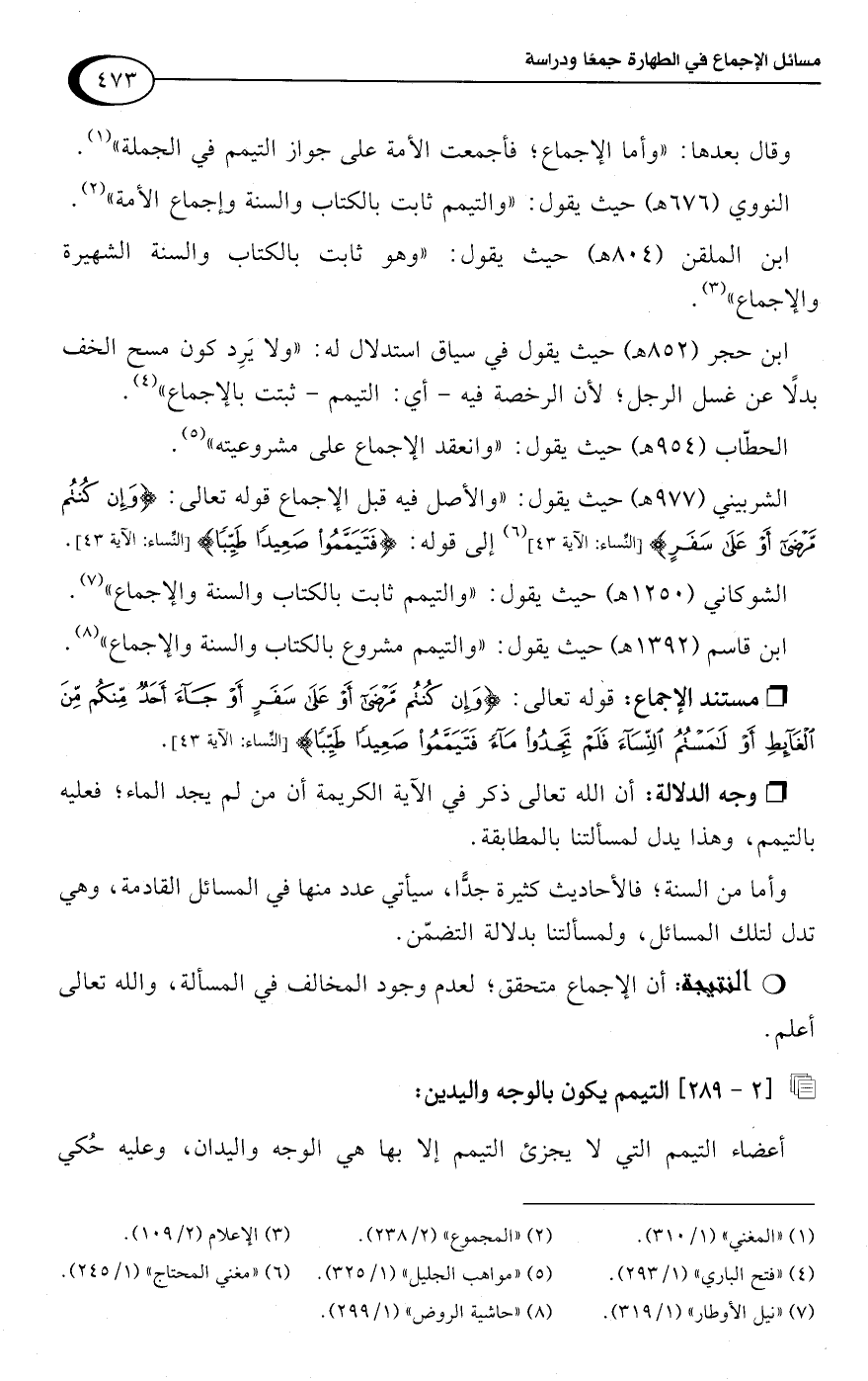 ابن قاسم (1392 هـ) حيث يقول: "والتيمم مشروع بالكتاب والسنة والإجماع" (¬8).