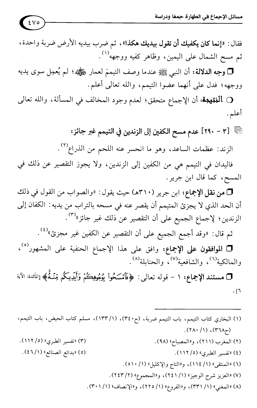 • من نقل الإجماع: ابن جرير (310 هـ) حيث يقول: "والصواب من القول في ذلك أن الحد الذي لا يجزئ المتيمم أن يقصر عنه في مسحه بالتراب من يديه: الكفان إلى الزندين؛ لإجماع الجميع على أن التقصير عن ذلك غير جائز" (¬3).