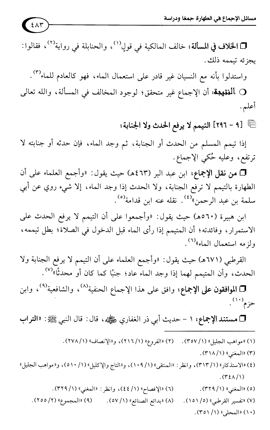 واستدلوا بأنه مع النسيان غير قادر على استعمال الماء، فهو كالعادم للماء (¬3).Rأن الإجماع غير متحقق؛ لوجود المخالف في المسألة، واللَّه تعالى أعلم.