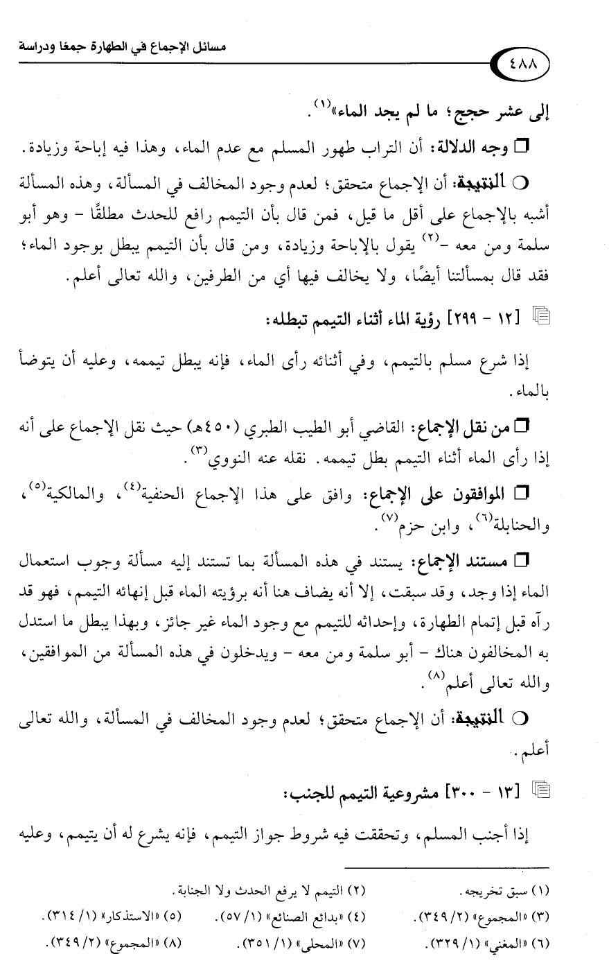 • مستند الإجماع: يستند في هذه المسألة بما تستند إليه مسألة وجوب استعمال الماء إذا وجد، وقد سبقت، إلا أنه يضاف هنا أنه برؤيته الماء قبل إنهائه التيمم، فهو قد رآه قبل إتمام الطهارة، وإحداثه للتيمم مع وجود الماء غير جائز، وبهذا يبطل ما استدل به المخالفون هناك -أبو سلمة ومن معه- ويدخلون في هذه المسألة من الموافقين، واللَّه تعالى أعلم (¬8).Rأن الإجماع متحقق؛ لعدم وجود المخالف في المسألة، واللَّه تعالى أعلم.
