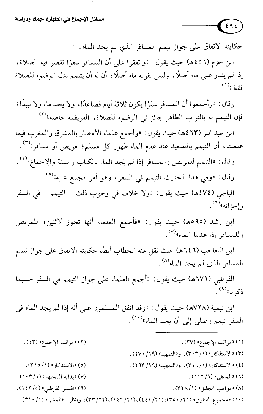 ابن تيمية (728 هـ) حيث يقول: "وقد اتفق المسلمون على أنه إذا لم يجد الماء في السفر تيمم وصلى إلى أن يجد الماء" (¬10).