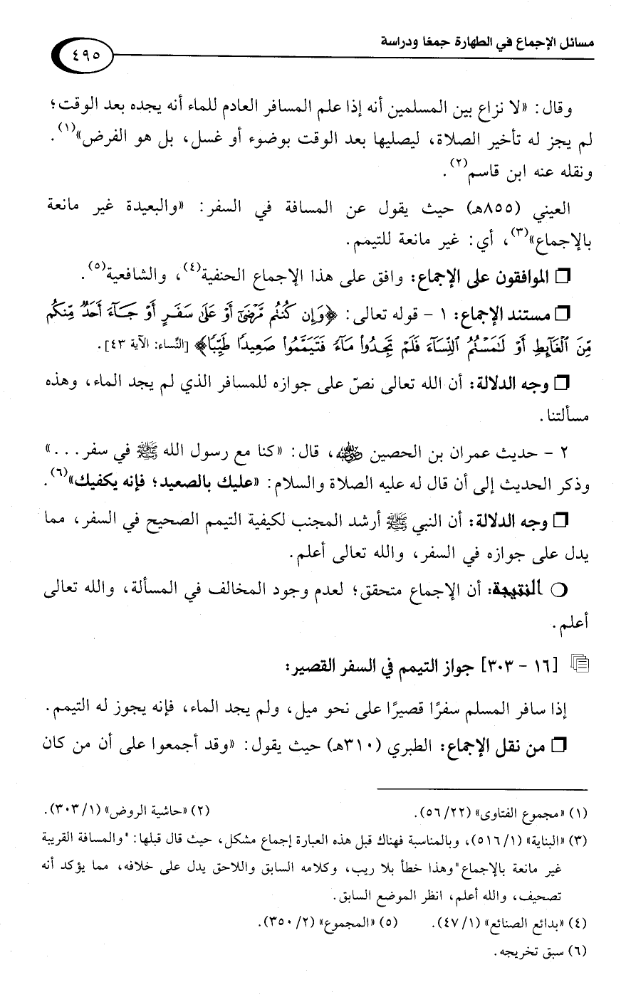 العيني (855 هـ) حيث يقول عن المسافة في السفر: "والبعيدة غير مانعة بالإجماع" (¬3)، أي: غير مانعة للتيمم.