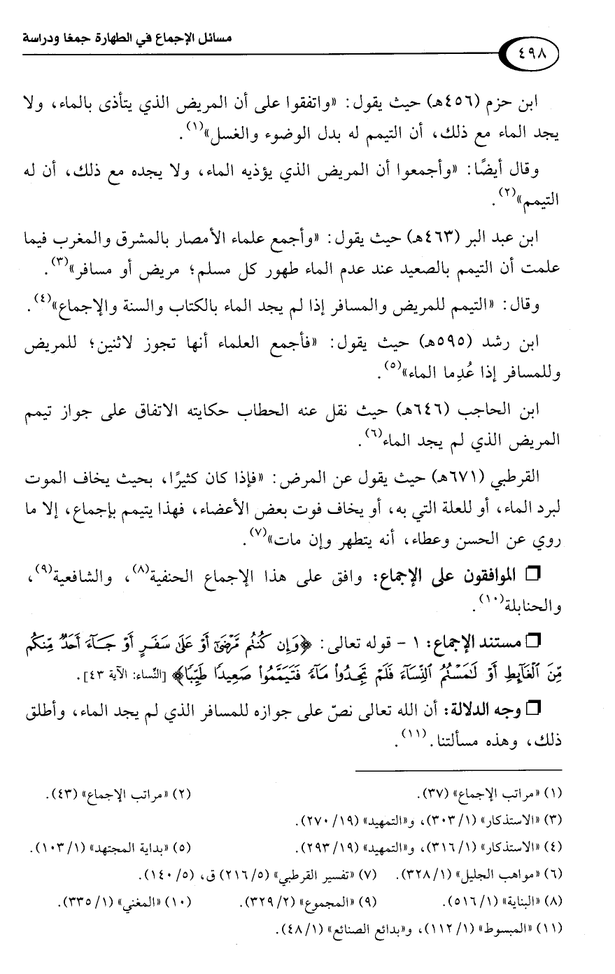 ابن رشد (595 هـ) حيث يقول: "فأجمع العلماء أنها تجوز لاثنين؛ للمريض وللمسافر إذا عُدِما الماء" (¬5).