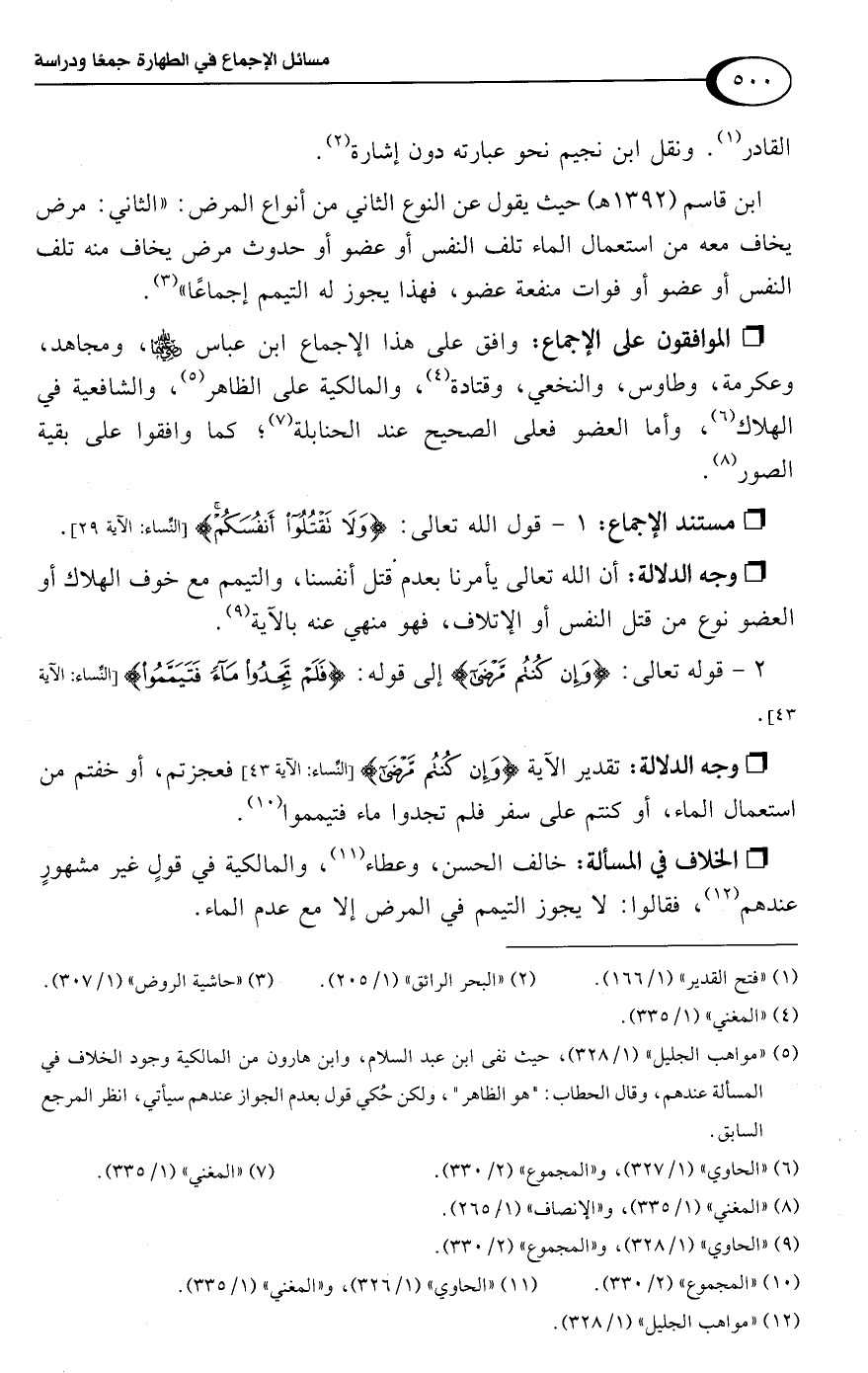ابن قاسم (1392 هـ) حيث يقول عن النوع الثاني من أنواع المرض: "الثاني: مرض يخاف معه من استعمال الماء تلف النفس أو عضو أو حدوث مرض يخاف منه تلف النفس أو عضو أو فوات منفعة عضو، فهذا يجوز له التيمم إجماعًا" (¬3).