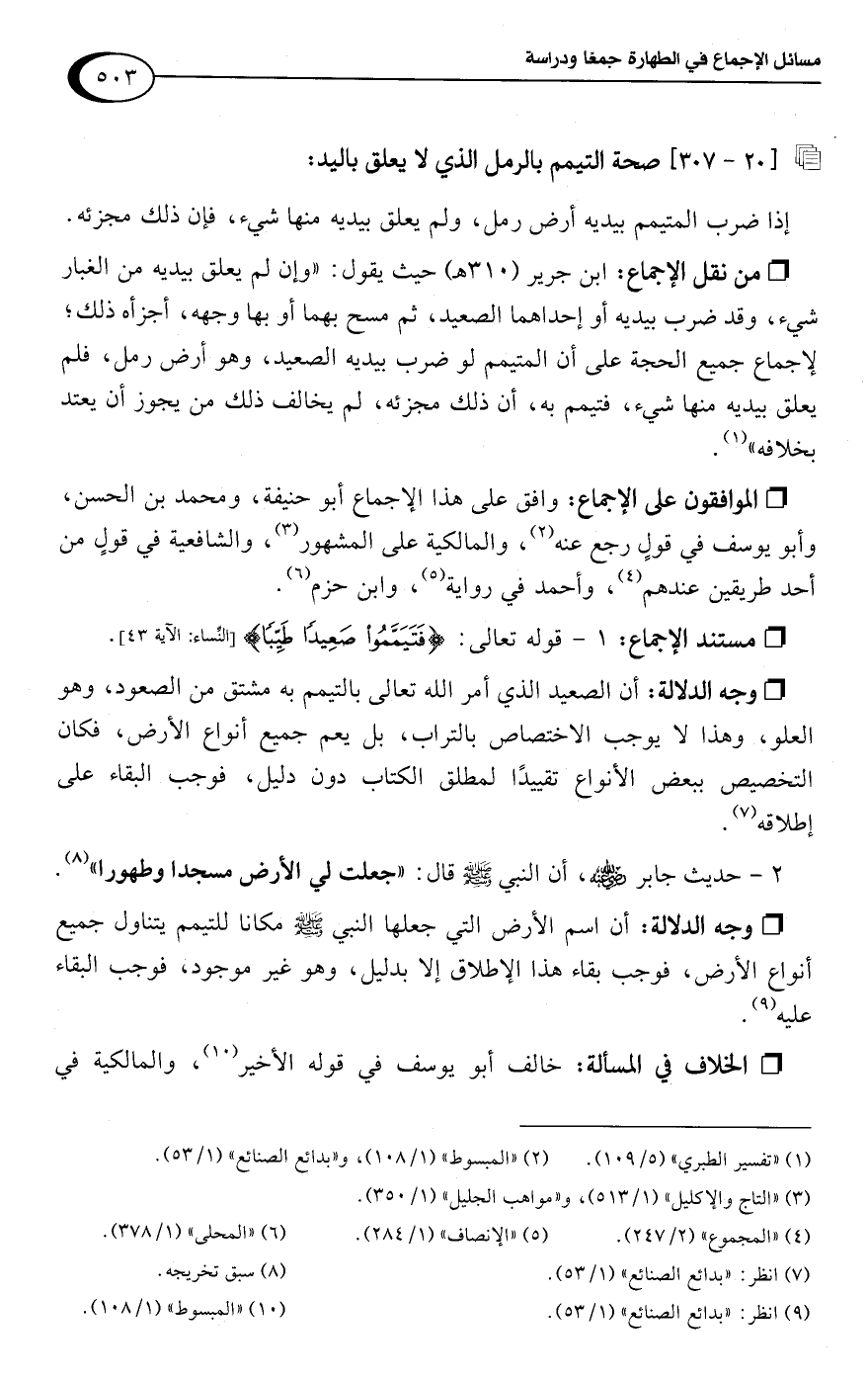 • من نقل الإجماع: ابن جرير (310 هـ) حيث يقول: "وإن لم يعلق بيديه من الغبار شيء، وقد ضرب بيديه أو إحداهما الصعيد، ثم مسح بهما أو بها وجهه، أجزأه ذلك؛ لإجماع جميع الحجة على أن المتيمم لو ضرب بيديه الصعيد، وهو أرض رمل، فلم يعلق بيديه منها شيء، فتيمم به، أن ذلك مجزئه، لم يخالف ذلك من يجوز أن يعتد بخلافه" (¬1).