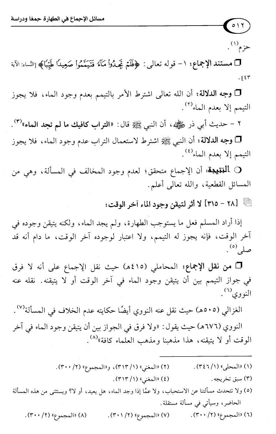 • من نقل الإجماع: المحاملي (415 هـ) حيث نقل الإجماع على أنه لا فرق في جواز التيمم بين أن يتيقن وجود الماء في آخر الوقت أو لا يتيقنه. نقله عنه النووي (¬6).