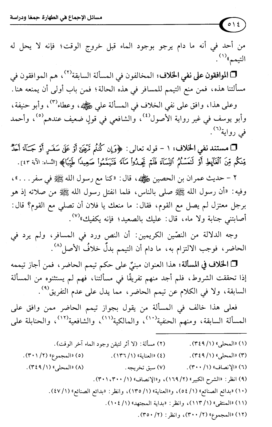 • الموافقون على نفي الخلاف: المخالفون في المسألة السابقة (¬2)، هم الموافقون في مسألتنا هذه، فمن منع التيمم للمسافر في هذه الحالة؛ فمن باب أولى أن يمنعه هنا.
