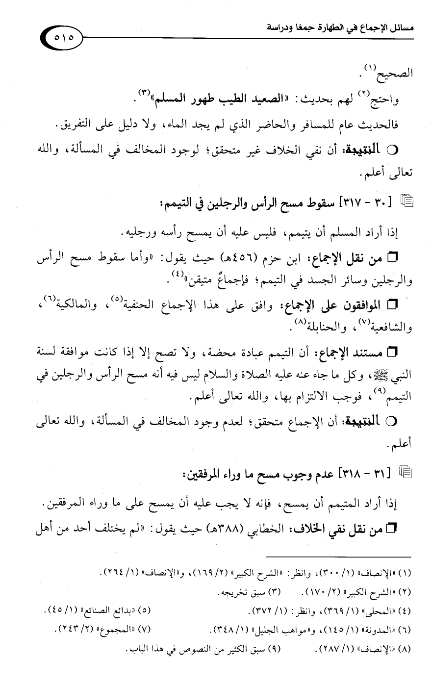 • من نقل الإجماع: ابن حزم (456 هـ) حيث يقول: "وأما سقوط مسح الرأس والرجلين وسائر الجسد في التيمم؛ فإجماعٌ متيقن" (¬4).