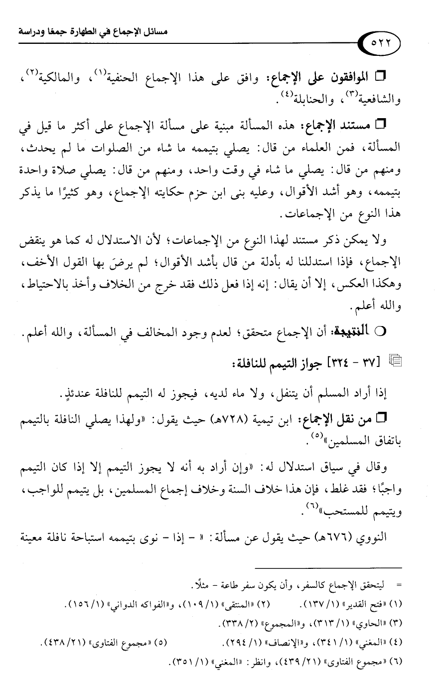 • من نقل الإجماع: ابن تيمية (728 هـ) حيث يقول: "ولهذا يصلي النافلة بالتيمم باتفاق المسلمين" (¬5).
