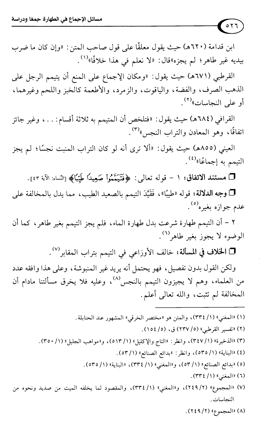 ابن قدامة (620 هـ) حيث يقول معلقًا على قول صاحب المتن: "وإن كان ما ضرب بيديه غير طاهر؛ لم يجزه" قال: "لا نعلم في هذا خلافًا" (¬1).