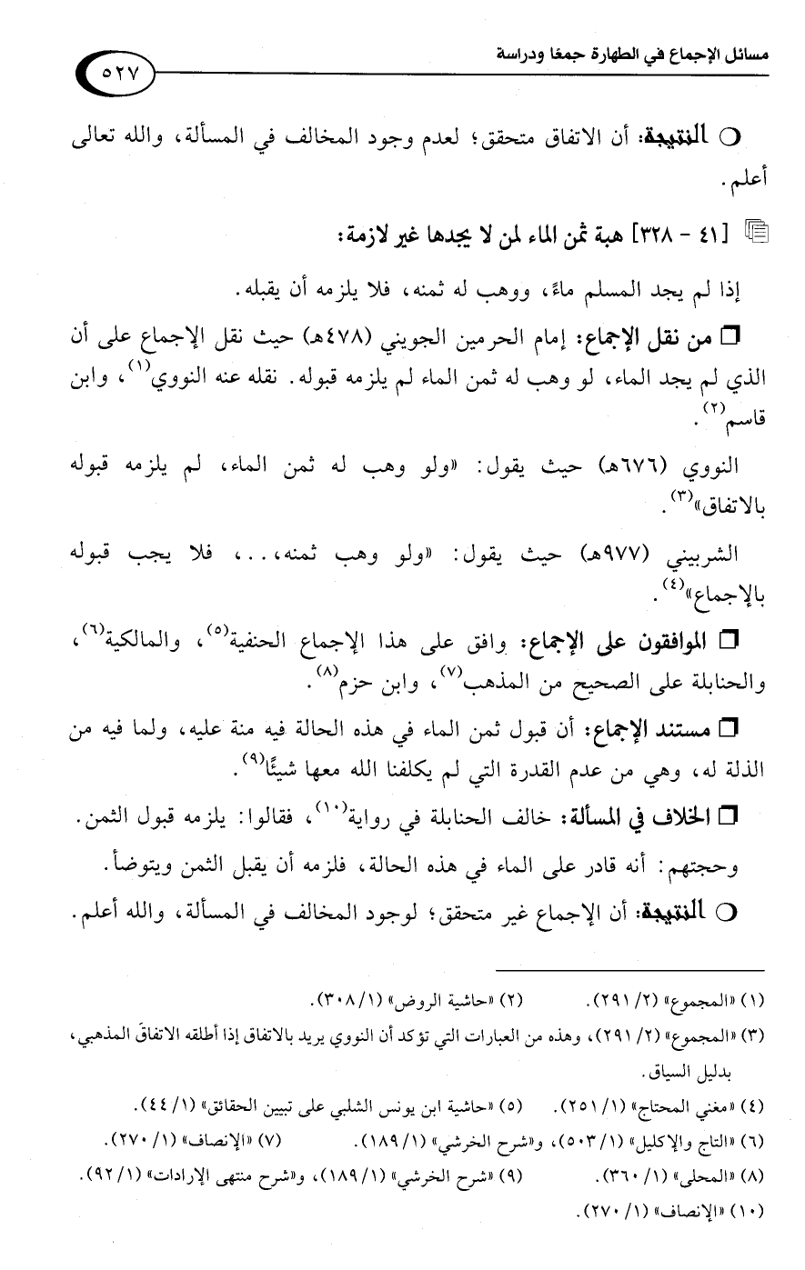• من نقل الإجماع: إمام الحرمين الجويني (478 هـ) حيث نقل الإجماع على أن الذي لم يجد الماء، لو وهب له ثمن الماء لم يلزمه قبوله. نقله عنه النووي (¬1)، وابن قاسم (¬2).
