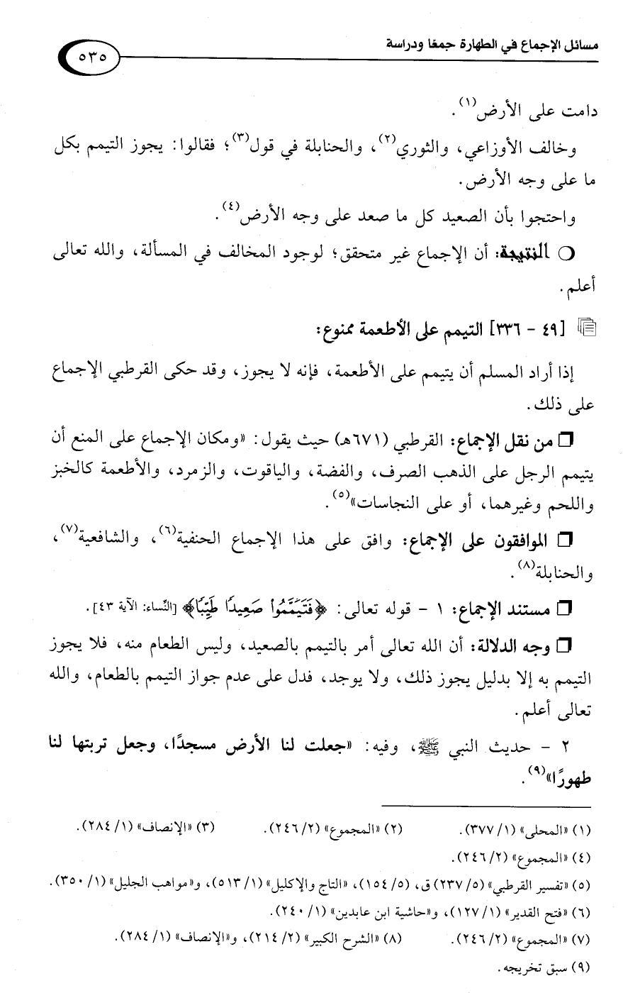• من نقل الإجماع: القرطبي (671 هـ) حيث يقول: "ومكان الإجماع على المنع أن يتيمم الرجل على الذهب الصرف، والفضة، والياقوت، والزمرد، والأطعمة كالخبز واللحم وغيرهما، أو على النجاسات" (¬5).