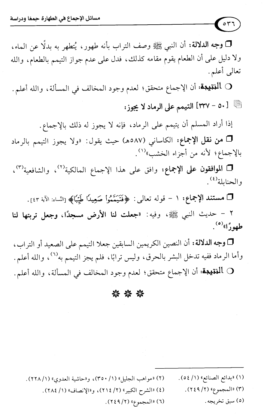 • وجه الدلالة: أن النصين الكريمين السابقين جعلا التيمم على الصعيد أو التراب، وأما الرماد ففيه تدخل البشر بالحرق، وليس ترابًا، فلم يجز التيمم به (¬6)، واللَّه أعلم.Rأن الإجماع متحقق؛ لعدم وجود المخالف في المسألة، واللَّه أعلم.