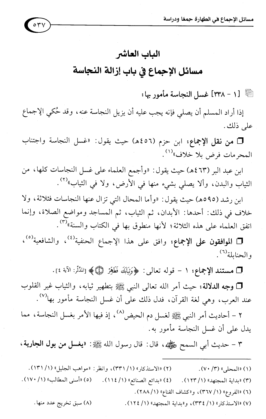 • من نقل الإجماع: ابن حزم (456 هـ) حيث يقول: "غسل النجاسة واجتناب المحرمات فرض بلا خلاف" (¬1).