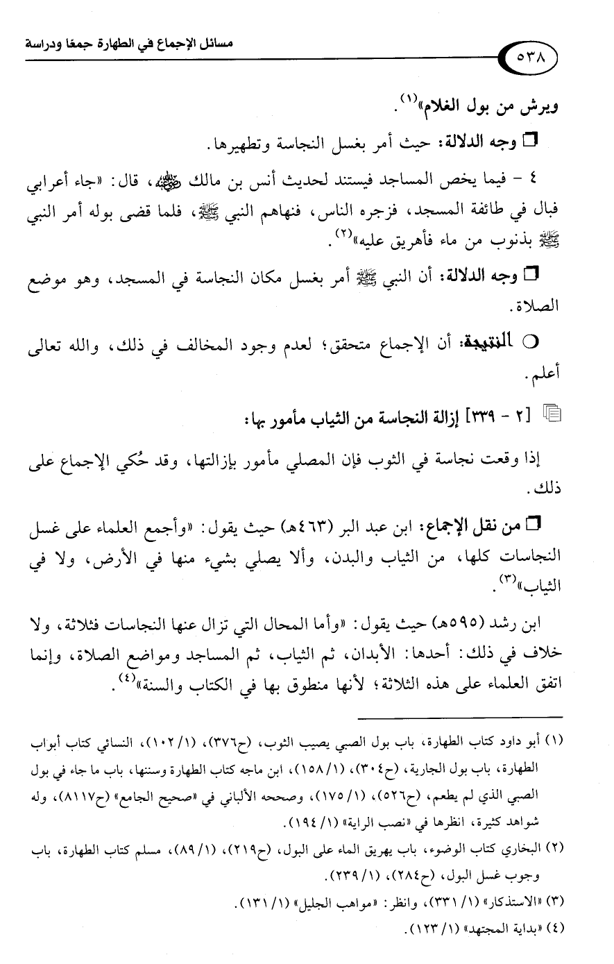 ابن رشد (595 هـ) حيث يقول: "وأما المحال التي تزال عنها النجاسات فثلاثة، ولا خلاف في ذلك: أحدها: الأبدان، ثم الثياب، ثم المساجد ومواضع الصلاة، وإنما اتفق العلماء على هذه الثلاثة؛ لأنها منطوق بها في الكتاب والسنة" (¬4).