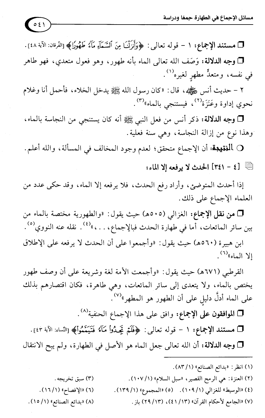 • من نقل الإجماع: الغزالي (505 هـ) حيث يقول: "والطهورية مختصة بالماء من بين سائر المائعات، أما في طهارة الحدث فبالإجماع، . .، " (¬4). نقله عنه النووي (¬5).