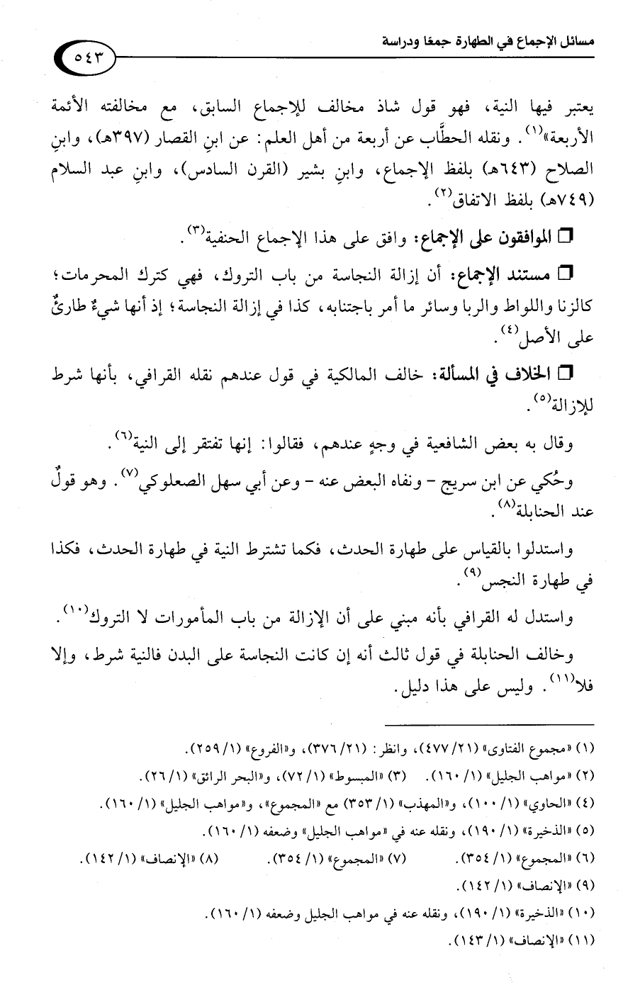 يعتبر فيها النية، فهو قول شاذ مخالف للإجماع السابق، مع مخالفته الأئمة الأربعة" (¬1). ونقله الحطَّاب عن أربعة من أهل العلم: عن ابنِ القصار (397 هـ)، وابنِ الصلاح (643 هـ) بلفظ الإجماع، وابنِ بشير (القرن السادس)، وابنِ عبد السلام (749 هـ) بلفظ الاتفاق (¬2).