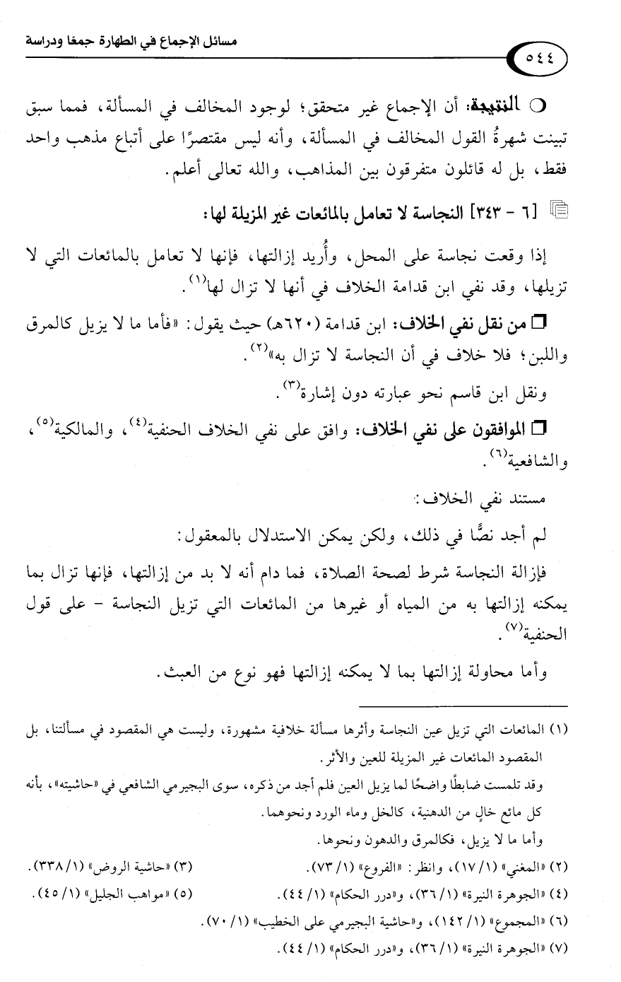 • من نقل نفي الخلاف: ابن قدامة (620 هـ) حيث يقول: "فأما ما لا يزيل كالمرق واللبن؛ فلا خلاف في أن النجاسة لا تزال به" (¬2).
