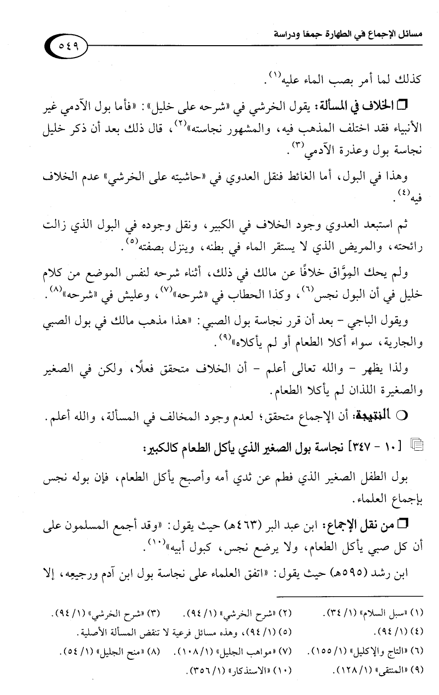 • من نقل الإجماع: ابن عبد البر (463 هـ) حيث يقول: "وقد أجمع المسلمون على أن كل صبي يأكل الطعام، ولا يرضع نجس، كبول أبيه" (¬10).