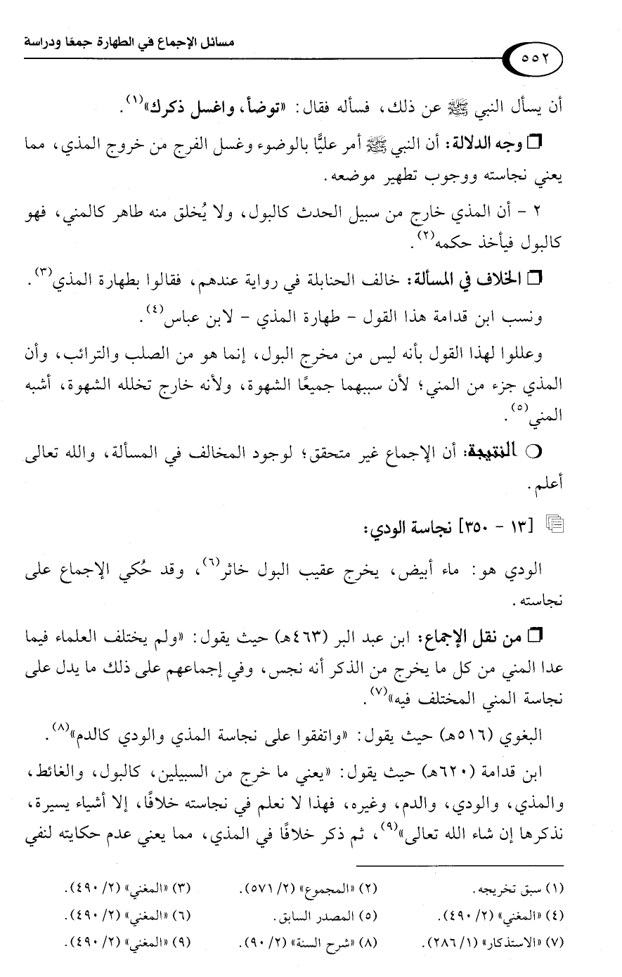 ابن قدامة (620 هـ) حيث يقول: "يعني ما خرج من السبيلين، كالبول، والغائط، والمذي، والودي، والدم، وغيره، فهذا لا نعلم في نجاسته خلافًا، إلا أشياء يسيرة، نذكرها إن شاء اللَّه تعالى" (¬9)، ثم ذكر خلافًا في المذي، مما يعني عدم حكايته لنفي