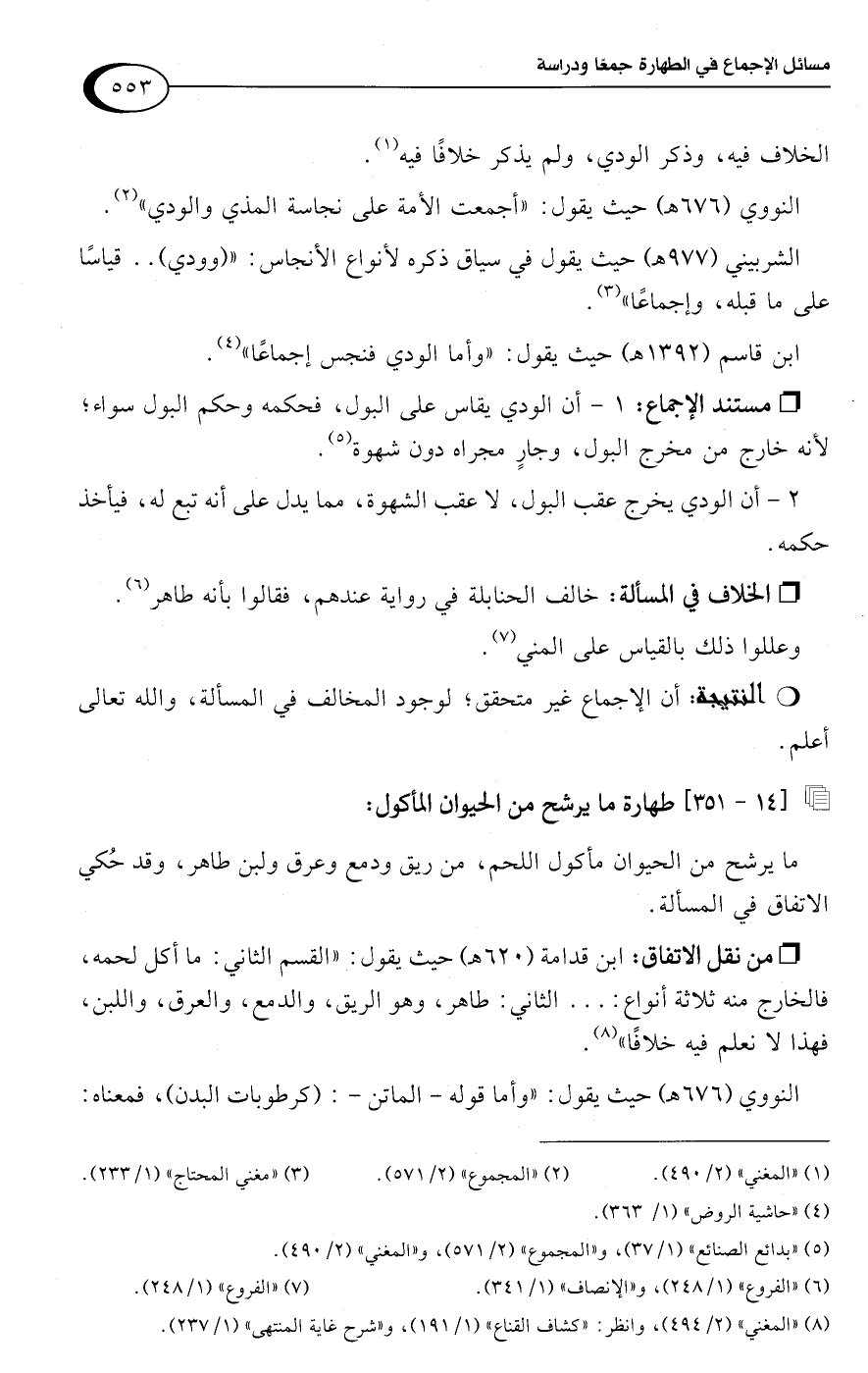وعللوا ذلك بالقياس على المني (¬7).Rأن الإجماع غير متحقق؛ لوجود المخالف في المسألة، واللَّه تعالى أعلم.