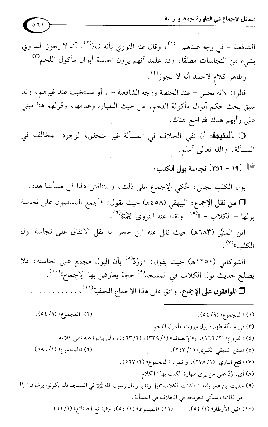 • من نقل الإجماع: البيهقي (458 هـ) حيث يقول: "أجمع المسلمون على نجاسة بولها -الكلاب-" (¬5). ونقله عنه النووي رحمه اللَّه (¬6).