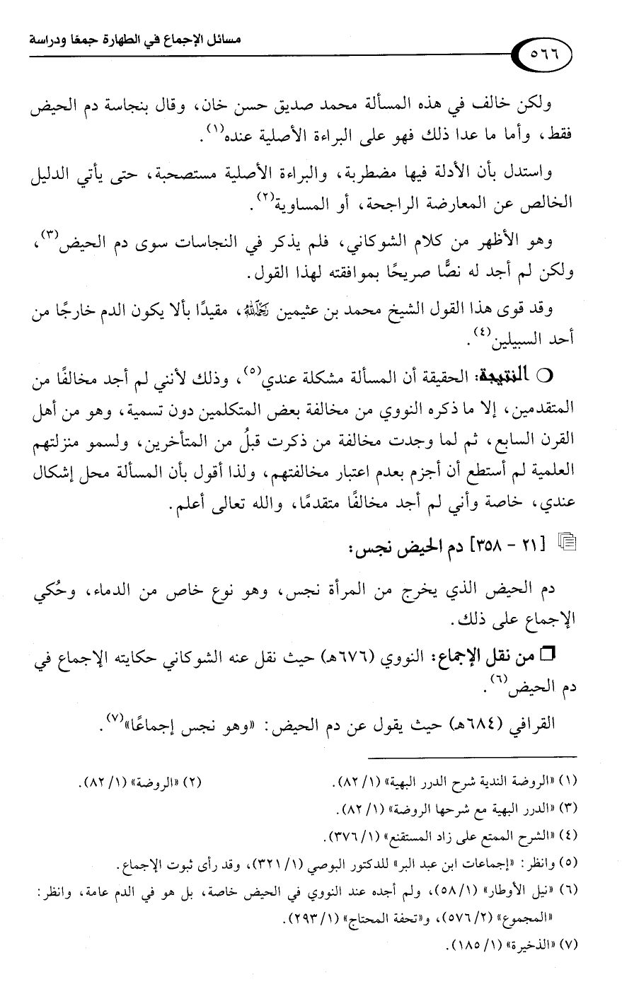 (¬6) "نيل الأوطار" (1/ 58)، ولم أجده عند النووي في الحيض خاصة، بل هو في الدم عامة، وانظر: "المجموع" (2/ 576)، و"تحفة المحتاج" (1/ 293).