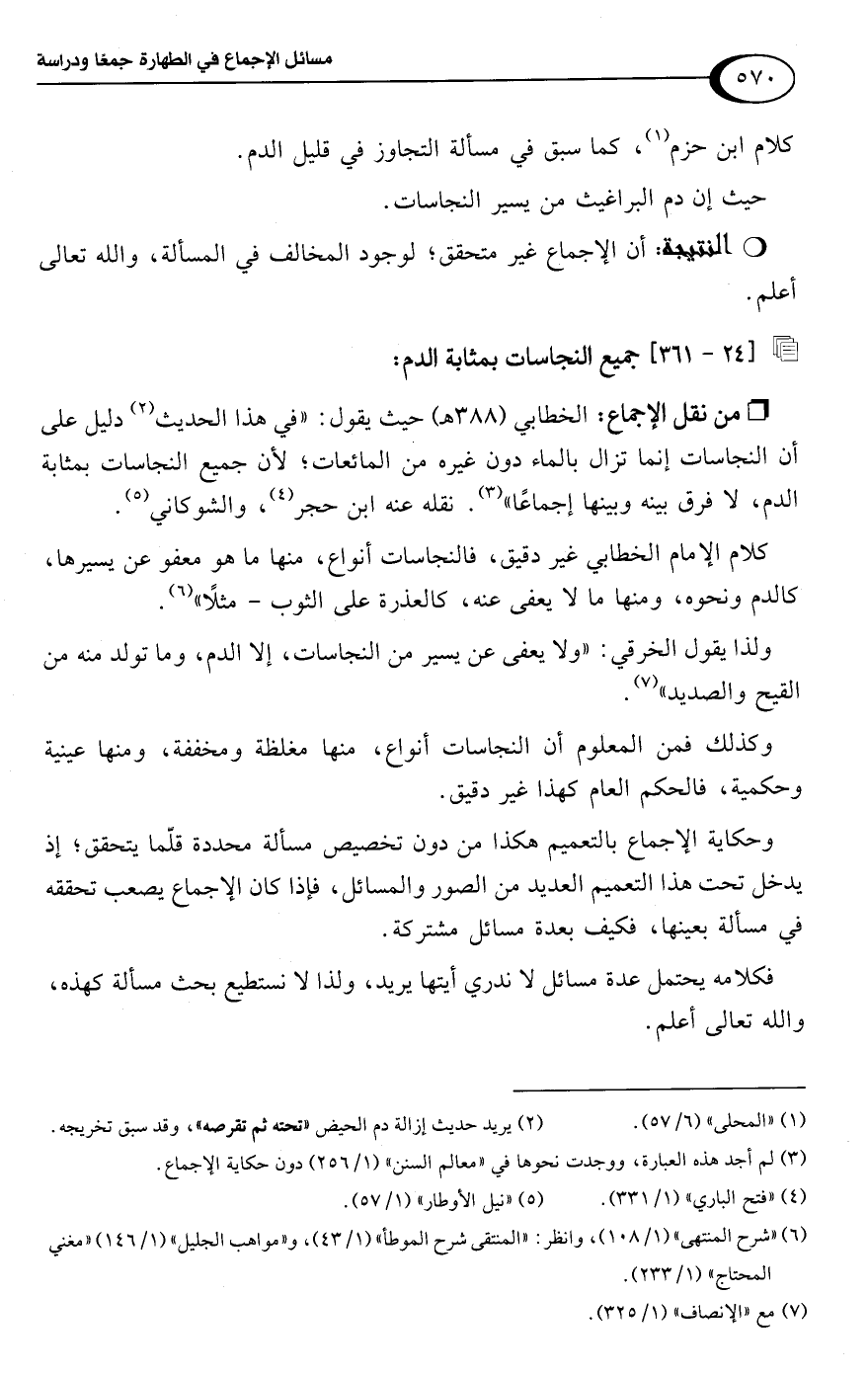 • من نقل الإجماع: الخطابي (388 هـ) حيث يقول: "في هذا الحديث (¬2) دليل على أن النجاسات إنما تزال بالماء دون غيره من المائعات؛ لأن جميع النجاسات بمثابة الدم، لا فرق بينه وبينها إجماعًا" (¬3). نقله عنه ابن حجر (¬4)، والشوكاني (¬5).