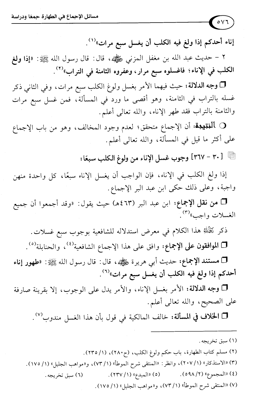 • مستند الإجماع: حديث أبي هريرة -رضي اللَّه عنه-، قال: قال رسول اللَّه -صلى اللَّه عليه وسلم-: "طهور إناء أحدكم إذا ولغ فيه الكلب أن يغسل سبع مرات" (¬6).