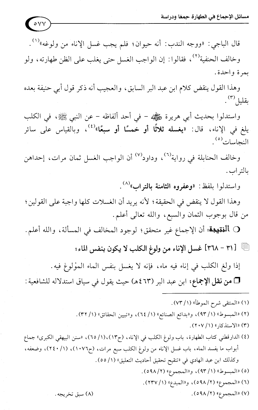 وهذا القول لا ينقض في الحقيقة؛ لأنه يريد أن الغسلات كلها واجبة على القولين؛ من قال بوجوب الثمان والسبع، واللَّه تعالى أعلم.Rأن الإجماع غير متحقق؛ لوجود المخالف في المسألة، واللَّه أعلم.