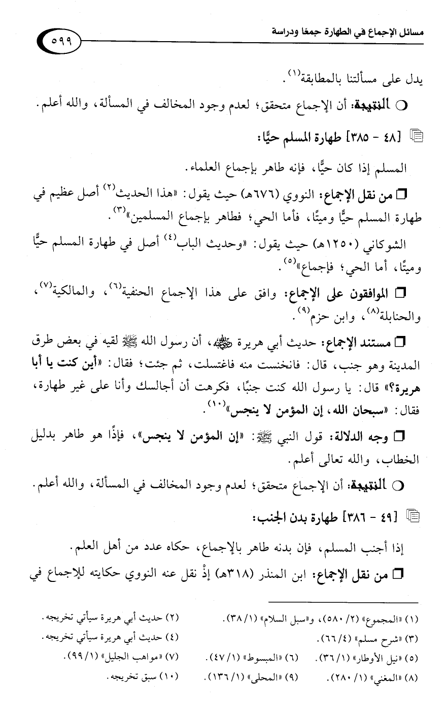 • من نقل الإجماع: النووي (676 هـ) حيث يقول: "هذا الحديث (¬2) أصل عظيم في طهارة المسلم حيًّا وميتًا، فأما الحي؛ فطاهر بإجماع المسلمين" (¬3).