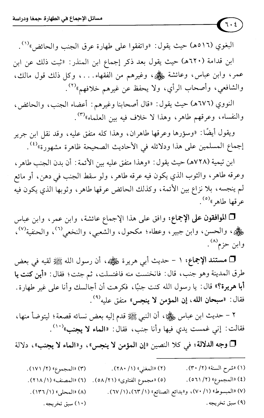 ابن تيمية (728 هـ) حيث يقول: "وهذا متفق عليه بين الأئمة: أن بدن الجنب طاهر، وعرقه طاهر، والثوب الذي يكون فيه عرقه طاهر، ولو سقط الجنب في دهن، أو مائع لم ينجسه، بلا نزاع بين الأئمة، وكذلك الحائض عرقها طاهر، وثوبها الذي يكون فيه عرقها طاهر" (¬5).