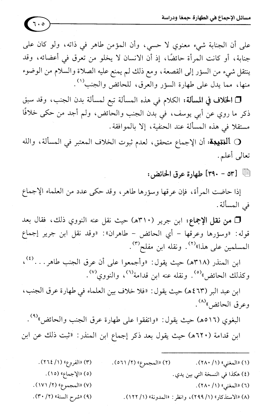 ابن المنذر (318 هـ) حيث يقول: "وأجمعوا على أن عرق الجنب طاهر. . . (¬4)، وكذلك الحائض" (¬5). ونقله عنه ابن قدامة (¬6)، والنووي (¬7).