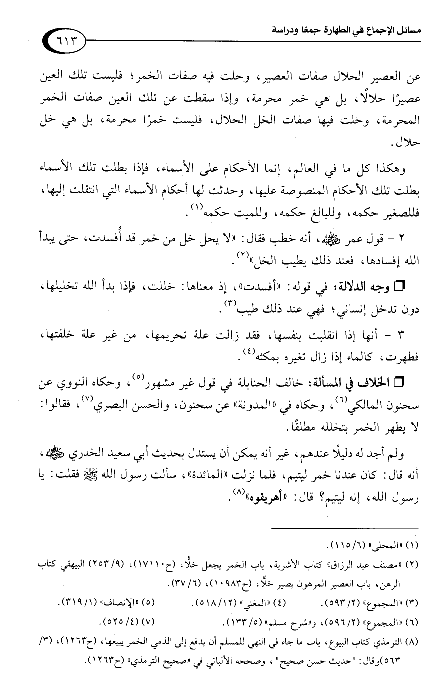 (¬2) "مصنف عبد الرزاق" كتاب الأشربة، باب الخمر يجعل خلًّا، (ح 17110)، (9/ 253) البيهقي كتاب الرهن، باب العصير المرهون يصير خلًّا، (ح 10983)، (6/ 37).