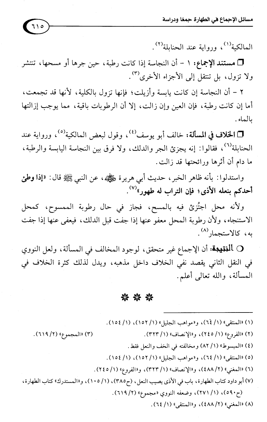 ولأنه محل اجتُزئ فيه بالمسح، فجاز في حال رطوبة الممسوح، كمحل الاستنجاء، ولأن رطوبة المحل معفو عنها إذا جفت قبل الدلك، فيعفى عنها إذا جفت به، كالاستجمار (¬8).Rأن الإجماع غير متحقق، لوجود المخالف في المسألة، ولعل النووي في النقل الثاني يقصد نفي الخلاف داخل مذهبه، ويدل لذلك كثرة الخلاف في المسألة، واللَّه تعالى أعلم.