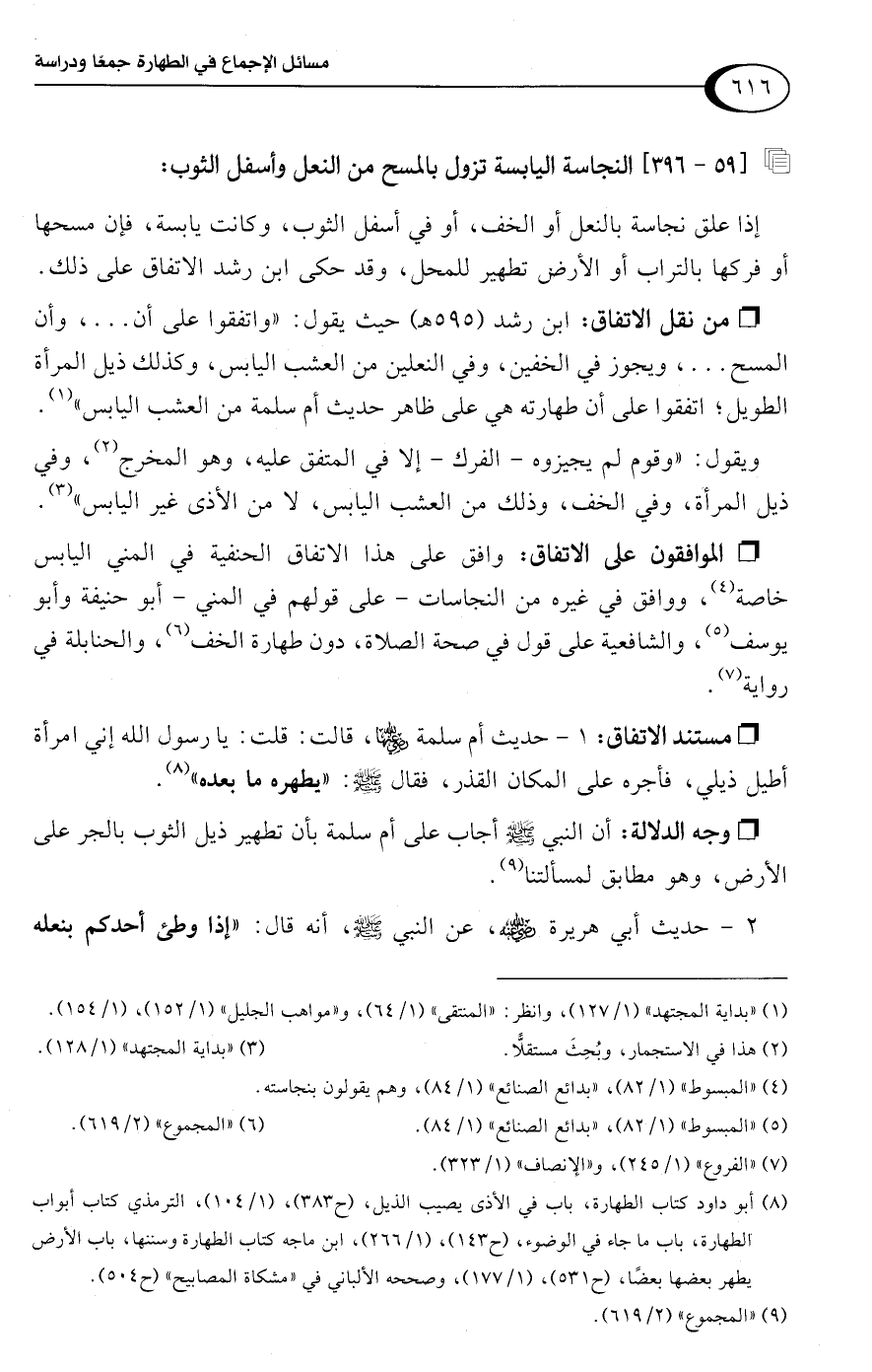 [59 - 396] النجاسة اليابسة تزول بالمسح من النعل وأسفل الثوب: