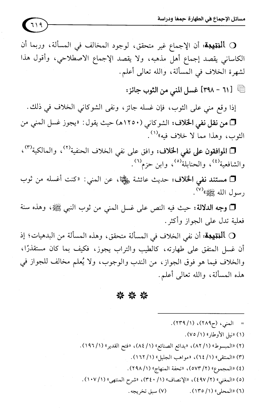 • من نقل نفي الخلاف: الشوكاني (1250 هـ) حيث يقول: "يجوز غسل المني من الثوب، وهذا مما لا خلاف فيه" (¬1).