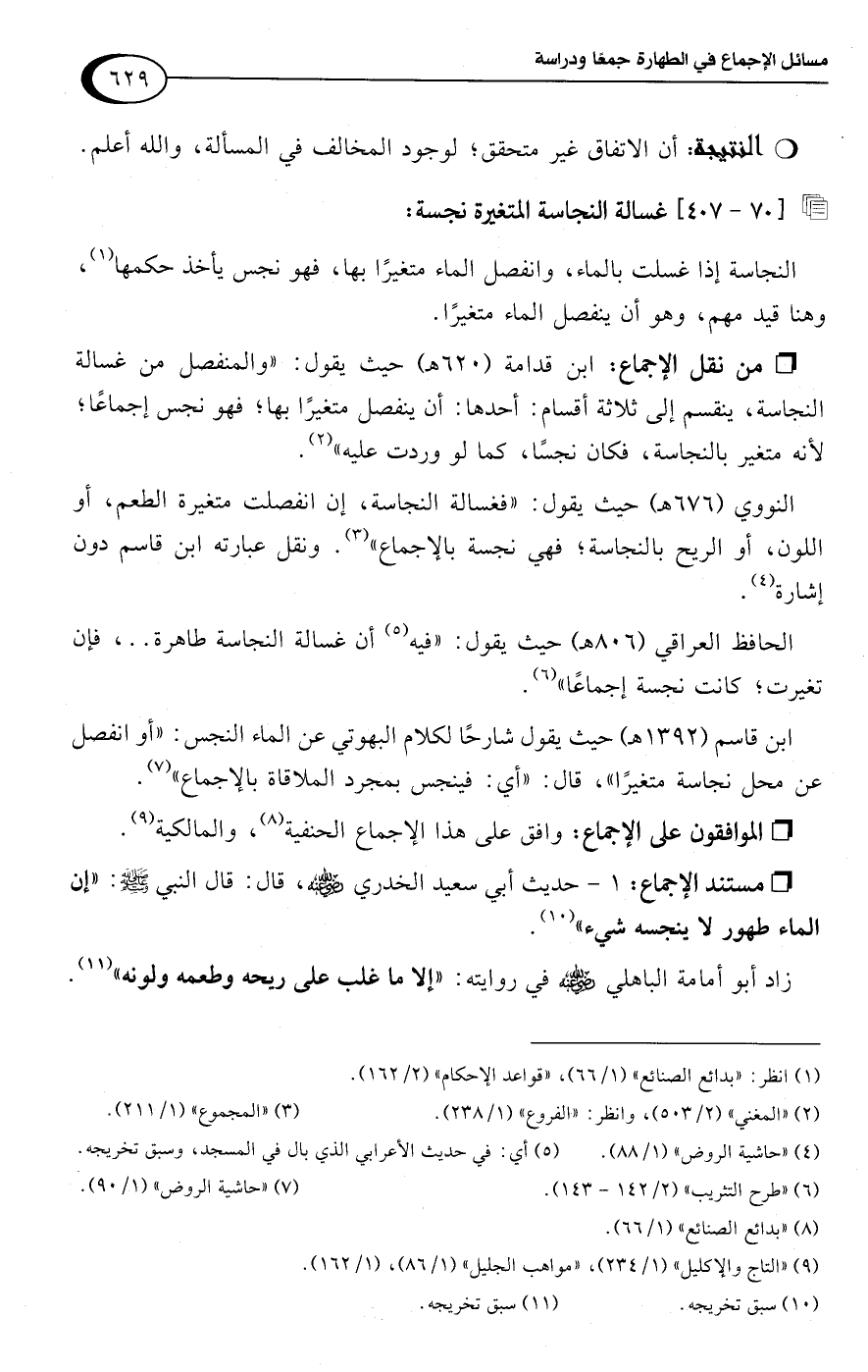 • من نقل الإجماع: ابن قدامة (620 هـ) حيث يقول: "والمنفصل من غسالة النجاسة، ينقسم إلى ثلاثة أقسام: أحدها: أن ينفصل متغيرًا بها؛ فهو نجس إجماعًا؛ لأنه متغير بالنجاسة، فكان نجسًا، كما لو وردت عليه" (¬2).