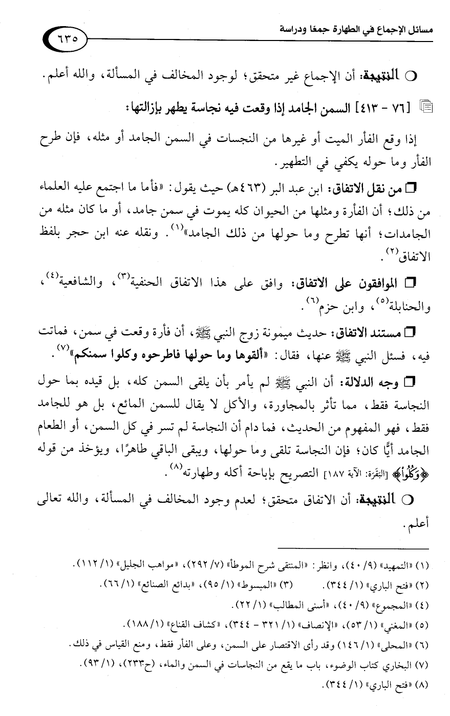 • وجه الدلالة: أن النبي -صلى اللَّه عليه وسلم- لم يأمر بأن يلقى السمن كله، بل قيده بما حول النجاسة فقط، مما تأثر بالمجاورة، والأكل لا يقال للسمن المائع، بل هو للجامد فقط، فهو المفهوم من الحديث، فما دام أن النجاسة لم تسر في كل السمن، أو الطعام الجامد أيًّا كان؛ فإن النجاسة تلقى وما حولها، ويبقى الباقي طاهرًا، ويؤخذ من قوله {وَكُلُوا} [البقرة: 187] التصريح بإباحة أكله وطهارته (¬8).Rأن الاتفاق متحقق؛ لعدم وجود المخالف في المسألة، واللَّه تعالى أعلم.